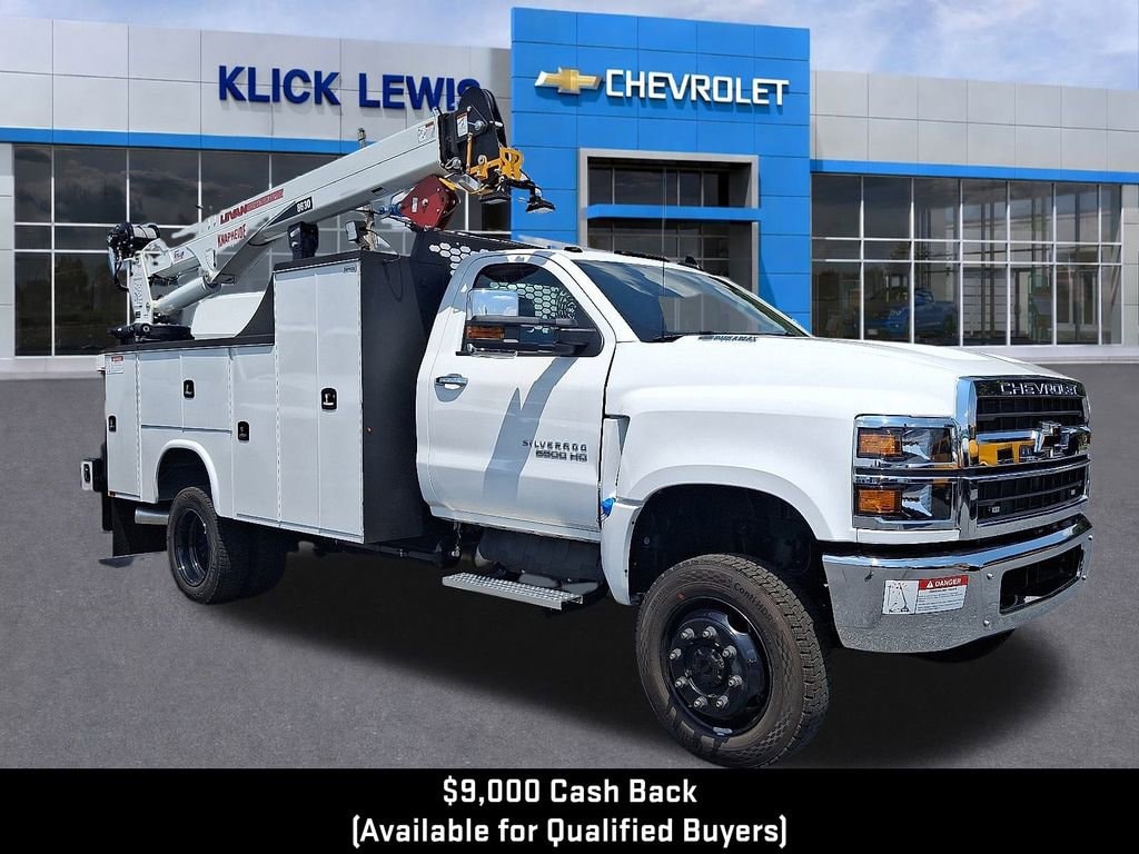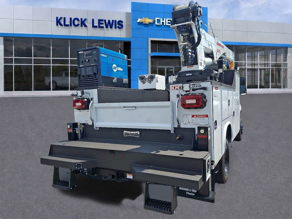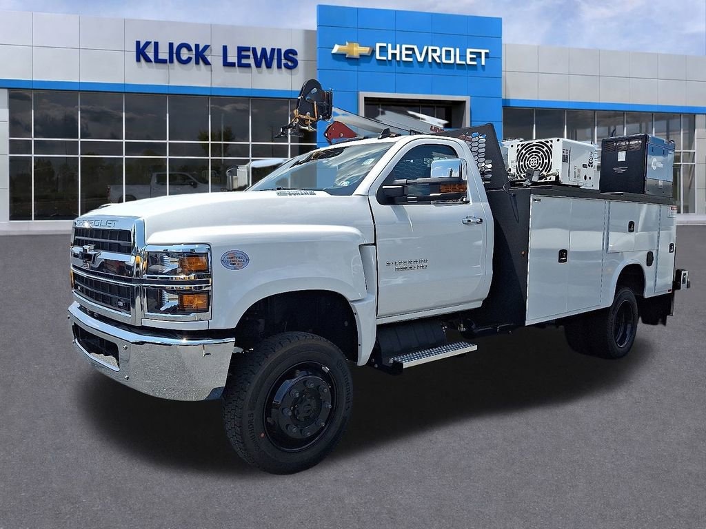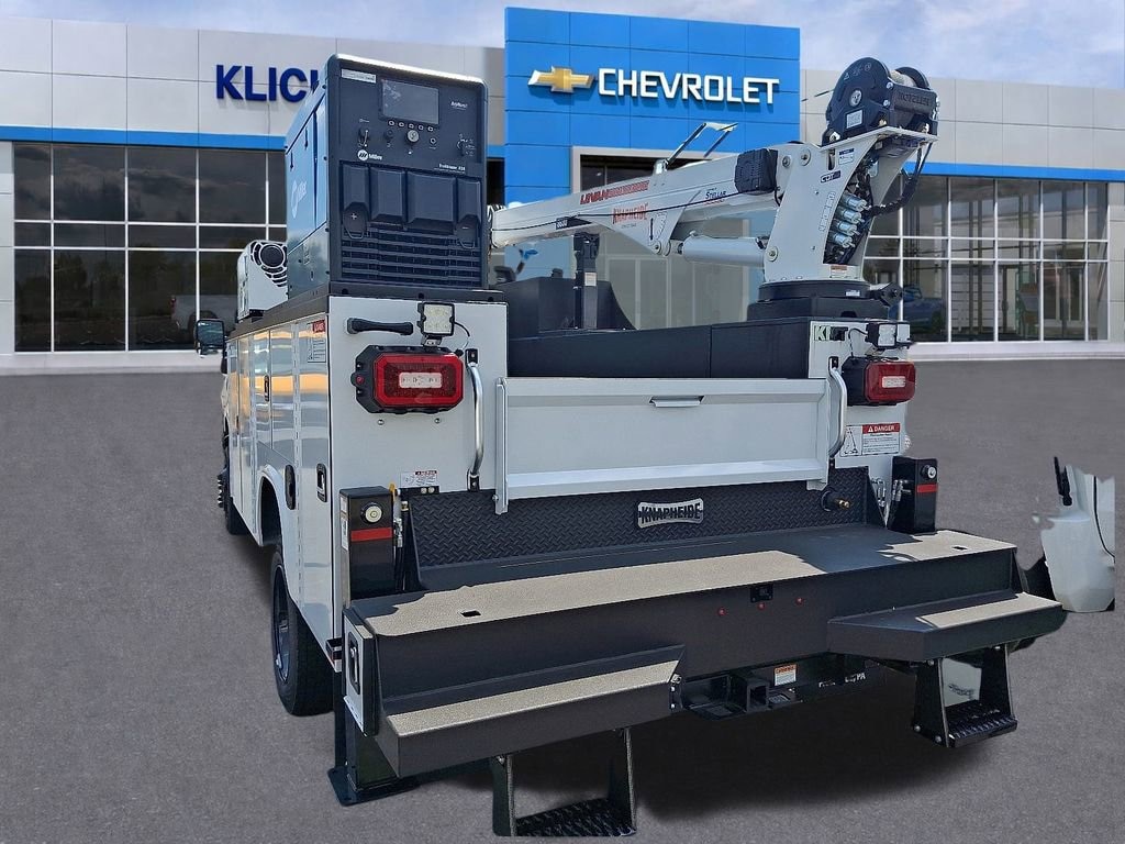 10-Way Power Driver's Seat Adjuster, 110-Volt AC Power Outlet, 34,000 lbs. GCWR (15,422 kg), 4.30 Rear Axle Ratio, 40/20/40 Front 3-Passenger Split Bench Seat, ABS brakes, Air Conditioning, Aluminum Assist Steps, Chevrolet Connected Access Capable, Chrome Front Bumper, Chrome Grille, Chrome Mirror Caps, Chrome Outside Door Handles, Cloth Seat Trim, Delay-off headlights, Driver door bin, Dual front impact airbags, Dual front side impact airbags, Dual rear wheels, Electronic Stability Control, Exterior Parking Camera Rear, Front Center Armrest w/Storage, Front License Plate Kit, Front reading lights, Front Stabilizer Bar, Frontal Passenger-Side Airbag Deactivation Switch, Fully automatic headlights, Manual Regeneration Diesel Particulate Filter DPF, Occupant sensing airbag, OnStar & Chevrolet Connected Services Capable, Overhead airbag, Overhead console, Passenger cancellable airbag, Passenger door bin, Power steering, Power Take-Off Engine Control Provisions, Power Windows w/Driver Express Up & Down, Premium audio system: Chevrolet MyLink, Rear Shock Absorbers, Remote Keyless Entry, Single-Slot CD/MP3 Player, Single-Zone Air Conditioning, SiriusXM Radio, Speed control, Tachometer, Tilt steering wheel, Top Post Threaded Battery Jump Start Stud, Traction control, Trip computer, Upfitter Electrical Provisions In Rear Of Frame, Variably intermittent wipers, Vocational Specific Heavy Suspension Package, Voltmeter, Wheels: 19.5 x 6.75 Black Painted Hub Piloted Steel w/8-Holes.