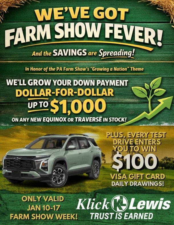 Disclaimer: Down payment match up to $1000 on select new Traverse and Equinox in stock only. Offer valid January 10-17, 2026 only. One entry per person for test drive giveaway. While supplies last. Gift card not redeemable for cash. Klick Lewis is not affiliated with the Pennsylvania Farm show. Say dealer for complete details.